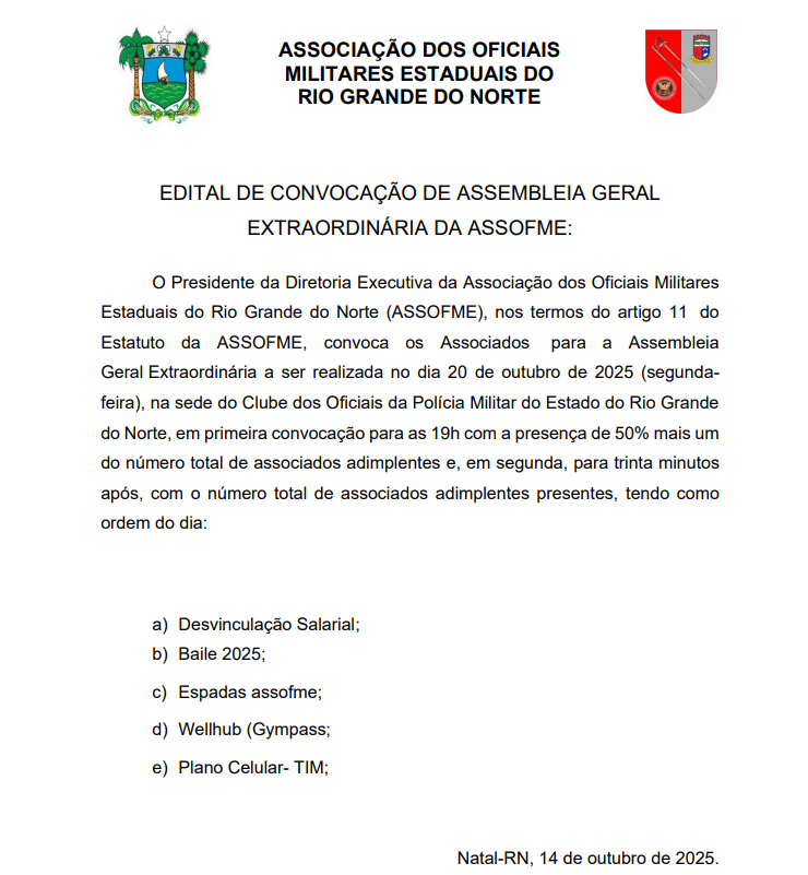 Geral Extraordinária a ser realizada no dia 20 de outubro de 2025 (segundafeira), na sede do Clube dos Oficiais da Polícia Militar do Estado do Rio Grande do Norte, em primeira convocação para as 19h com a presença de 50% mais um do número total de associados adimplentes e, em segunda, para trinta minutos após, com o número total de associados adimplentes presentes, tendo como ordem do dia: